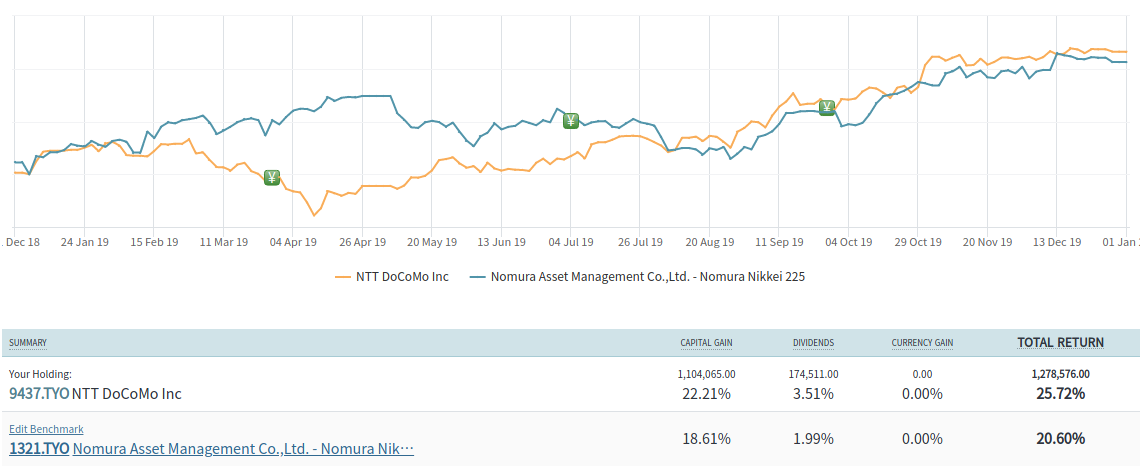 - 半年くらい低迷してたドコモも今年後半に伸びていったし、1年で見れば日経平均をアウトパフォームした (チャート)