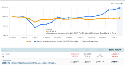 1566の新興国債券ETFも2年くらい持ってたけど、これは戦略見直しではなく新型コロナウイルスの勢いを見て逃げる形で売った。実際にこのときの売値が46400円でそれ以降はずっと値が戻らず、年末時点では45100円なので判断は正しかった。